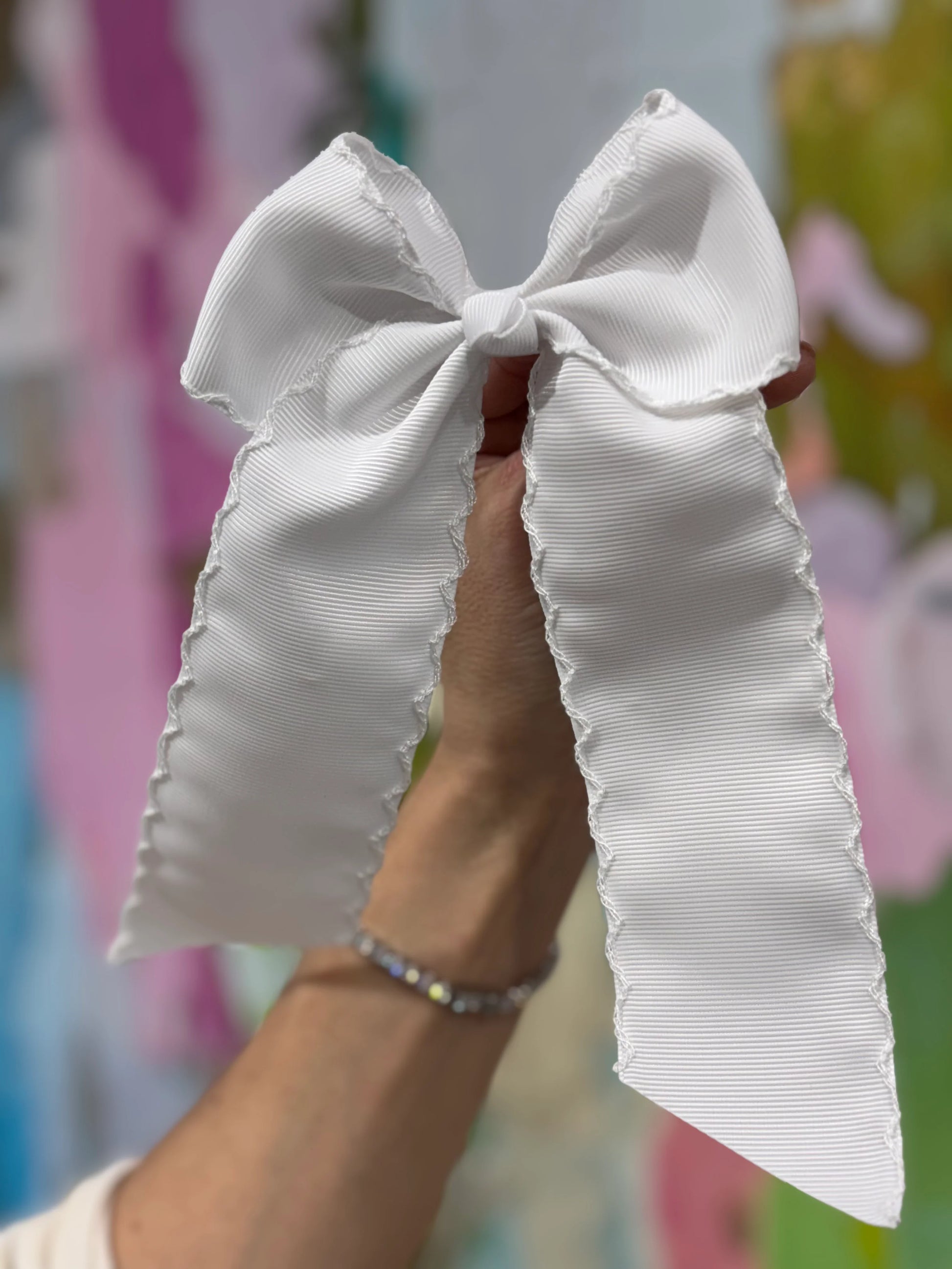 Our preppy long-tail bow size is approximately 6" long, 4" wide with a clip. Made with grosgrain ribbon. These are perfect for embroidery monogram.