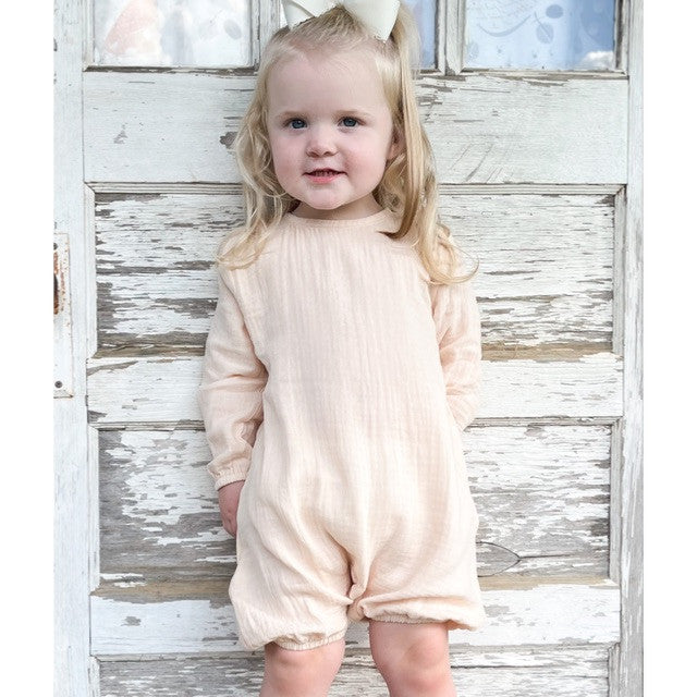 OUR MUSLIN ROMPERS ARE MADE FROM A DOUBLE LINED 100% MUSLIN COTTON MATERIAL. SNAPS IN THE CROTCH MAKE FOR EASY DIAPER CHANGES. ALONG WITH 3 BEAUTIFUL WOODEN BUTTONS EXTENDING DOWNWARD FROM THE BACK OF THE NECKLINE.